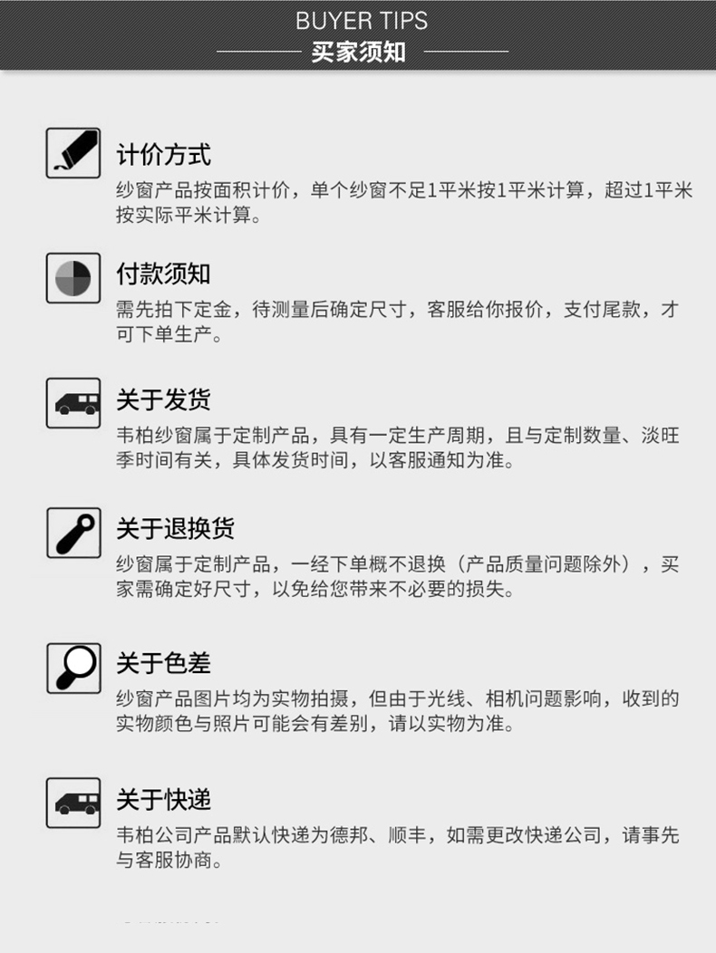 定制紗窗5扇以上(部分地區(qū)6扇以上),我們會(huì)提供免費(fèi)上門(mén)安裝服務(wù);拍下定金后,我們會(huì)在3日內(nèi)上門(mén)測(cè)量,測(cè)量后線上付清尾款,10-15天左右上門(mén)安裝;下單后如需修改尺寸,收取一定的費(fèi)用,產(chǎn)品報(bào)價(jià)均不含運(yùn)費(fèi);定制型產(chǎn)品一旦下單生產(chǎn),不接受質(zhì)量以外的退款;本公司產(chǎn)品在天貓、京東均有官方旗艦店,請(qǐng)大家認(rèn)準(zhǔn)摩爾戴克品牌,謹(jǐn)防假冒;計(jì)價(jià)方式如下:寬度不超過(guò)1.1米,高度不超過(guò)1.5米,480元/扇,對(duì)開(kāi)按照兩扇計(jì)費(fèi)。
