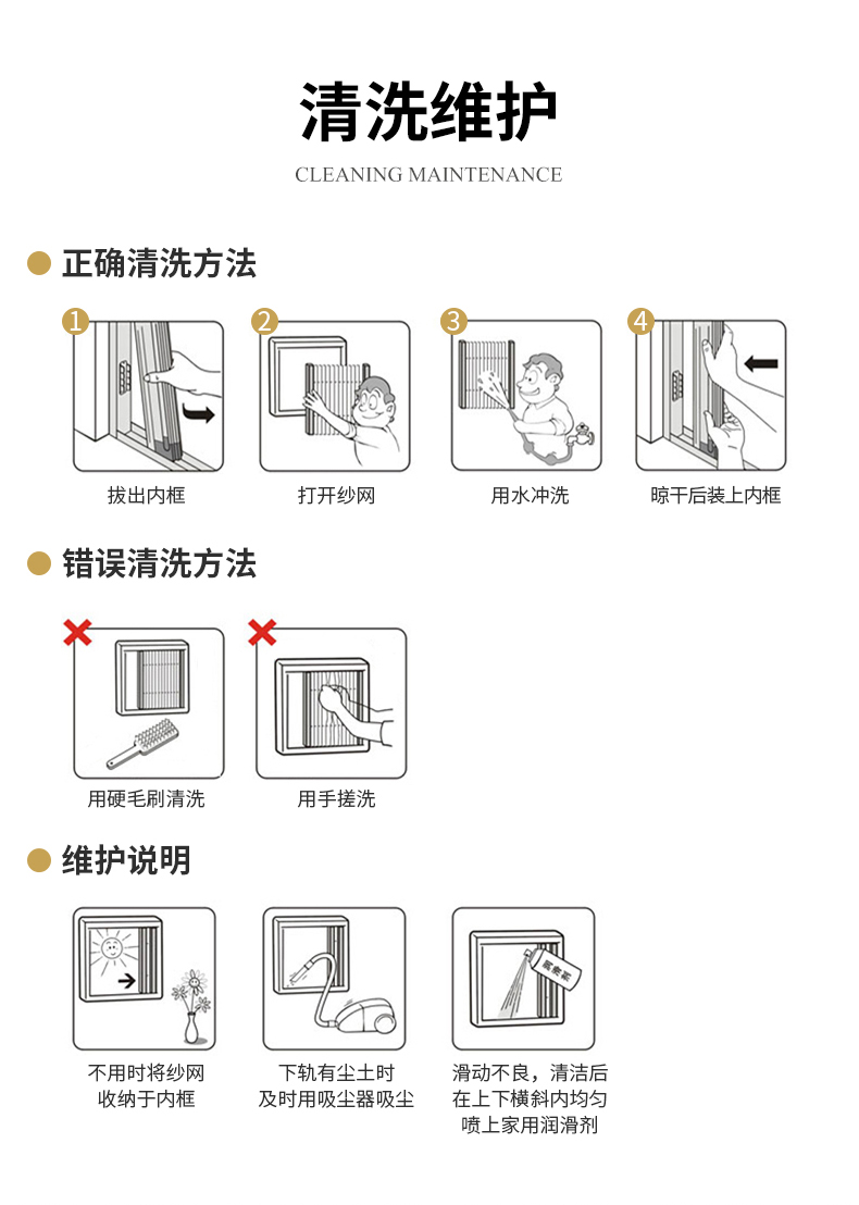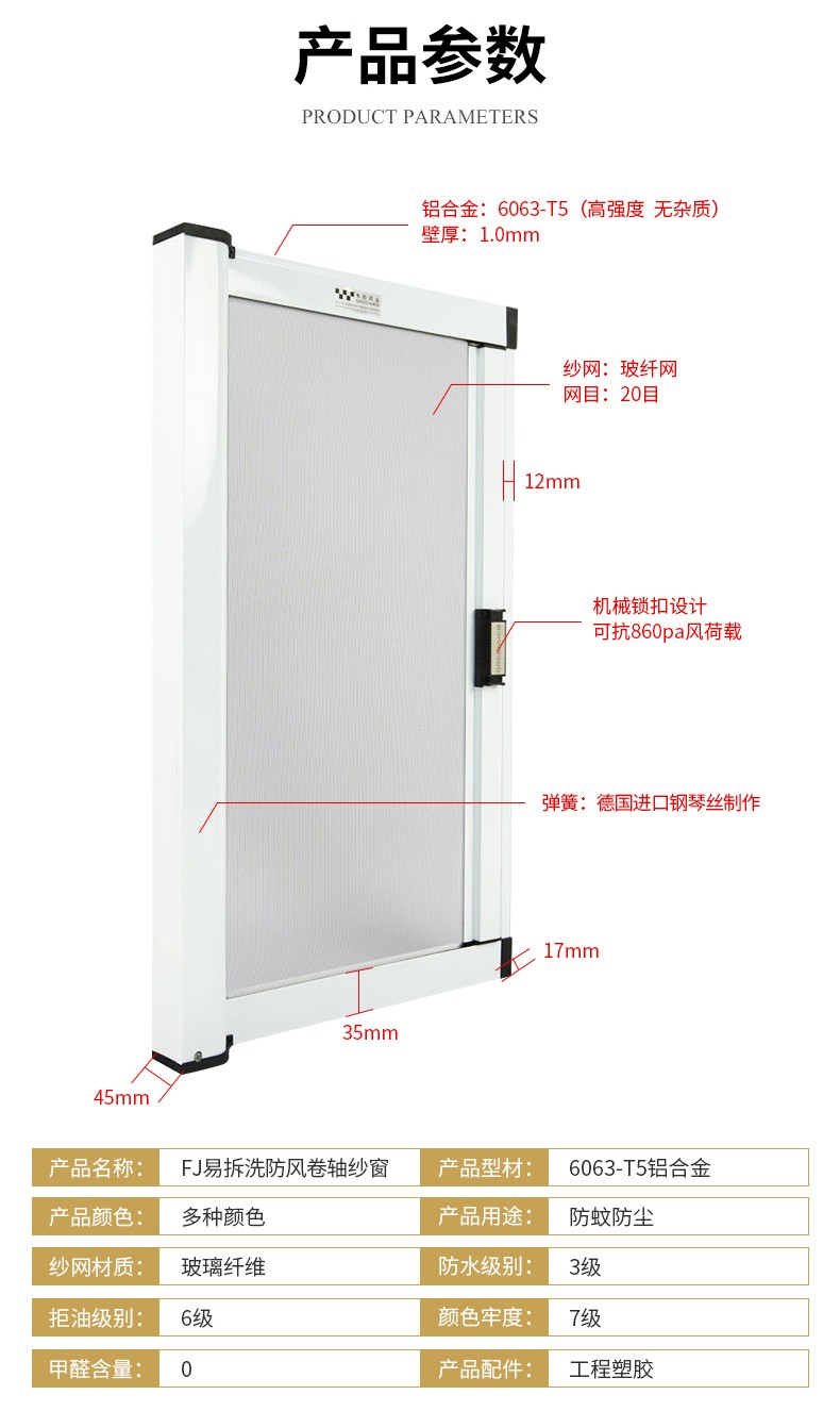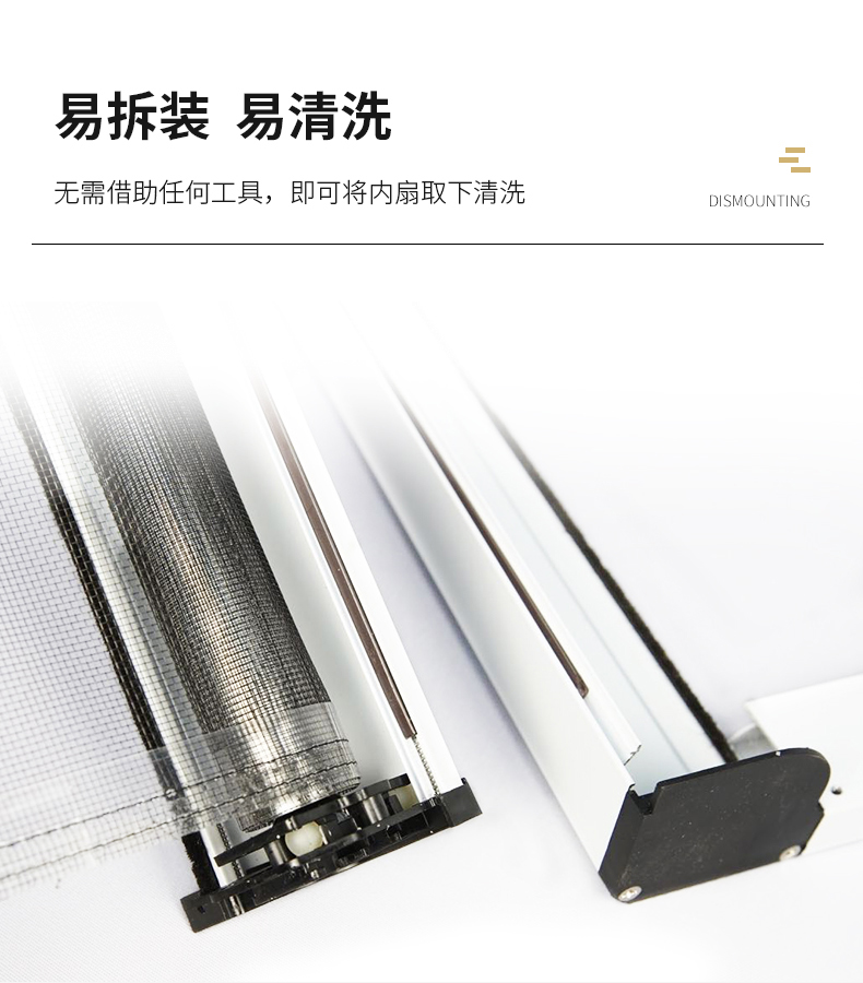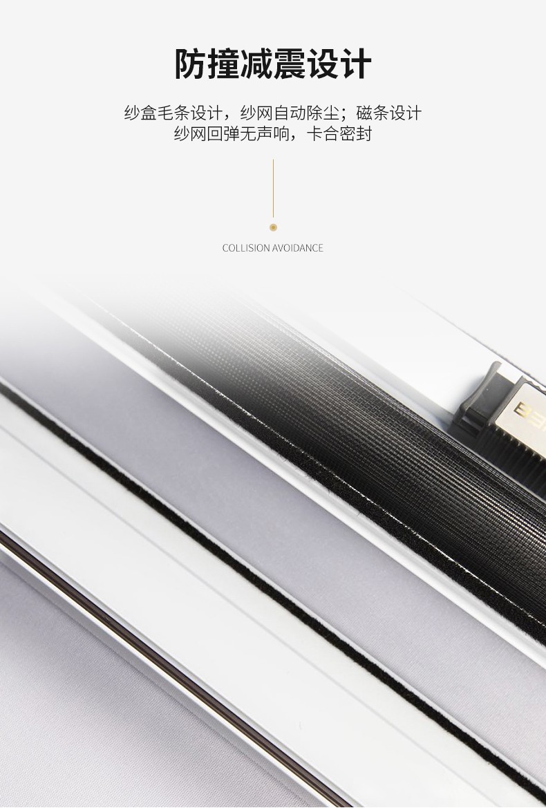 1.緩沖防撞 2.張力防風 3.安裝簡易 4.啟閉靈巧 5.自動除塵 6.紗網抗紫外實驗5 年無損傷 7.成品老化次數6 萬次無損傷